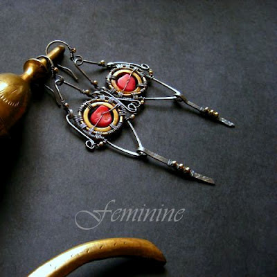Mosiądz, stop gold filled, srebro i kwarc dymny. W komplecie z wisiorem, widocznym na jednym ze zdjęć.